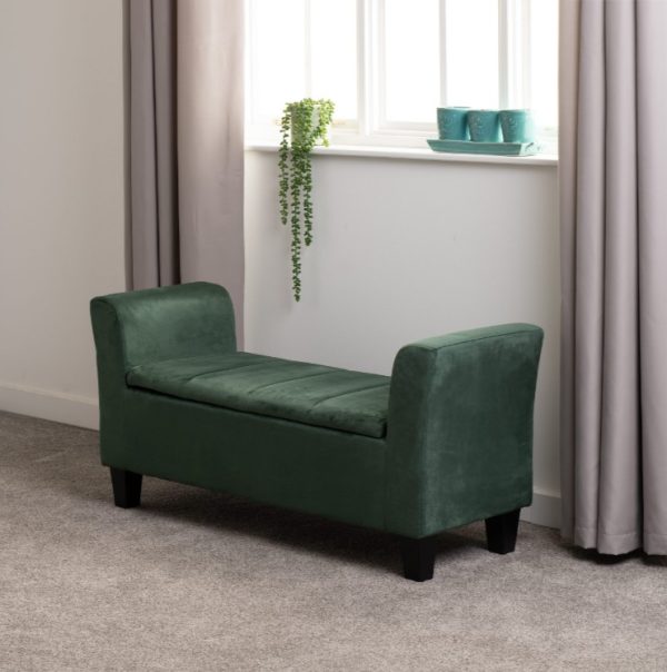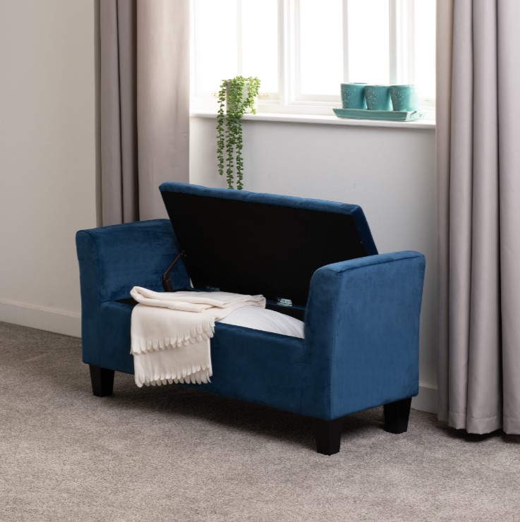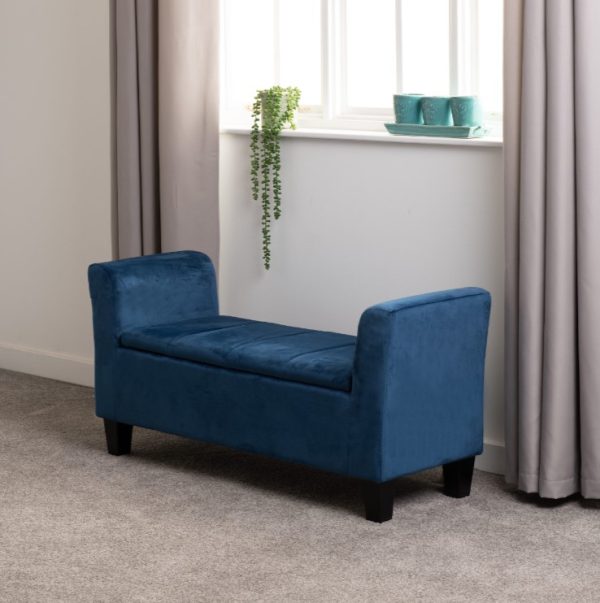 This soft velvet upholstered bench combines both storage and seating. Stands upon 4 solid wooden legs for stability.