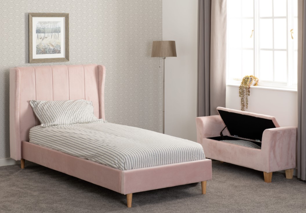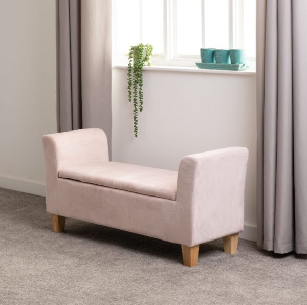 Soft velvet bench combines both storage and seating.