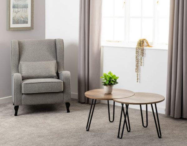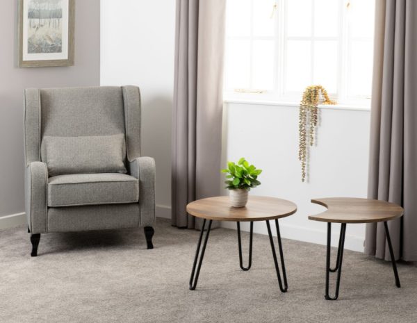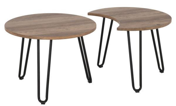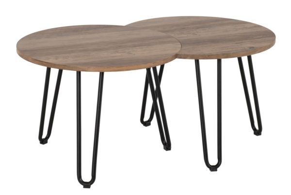 Wooden round top coffee table with black metal legs, a Medium Oak Effect finish and can be placed separately or together.
