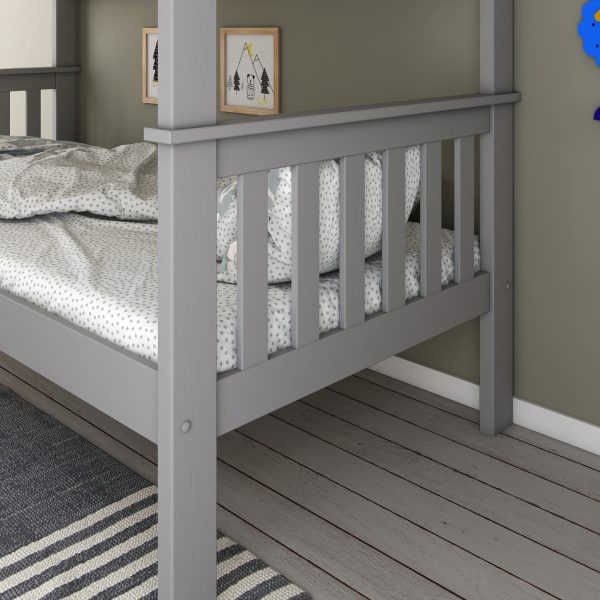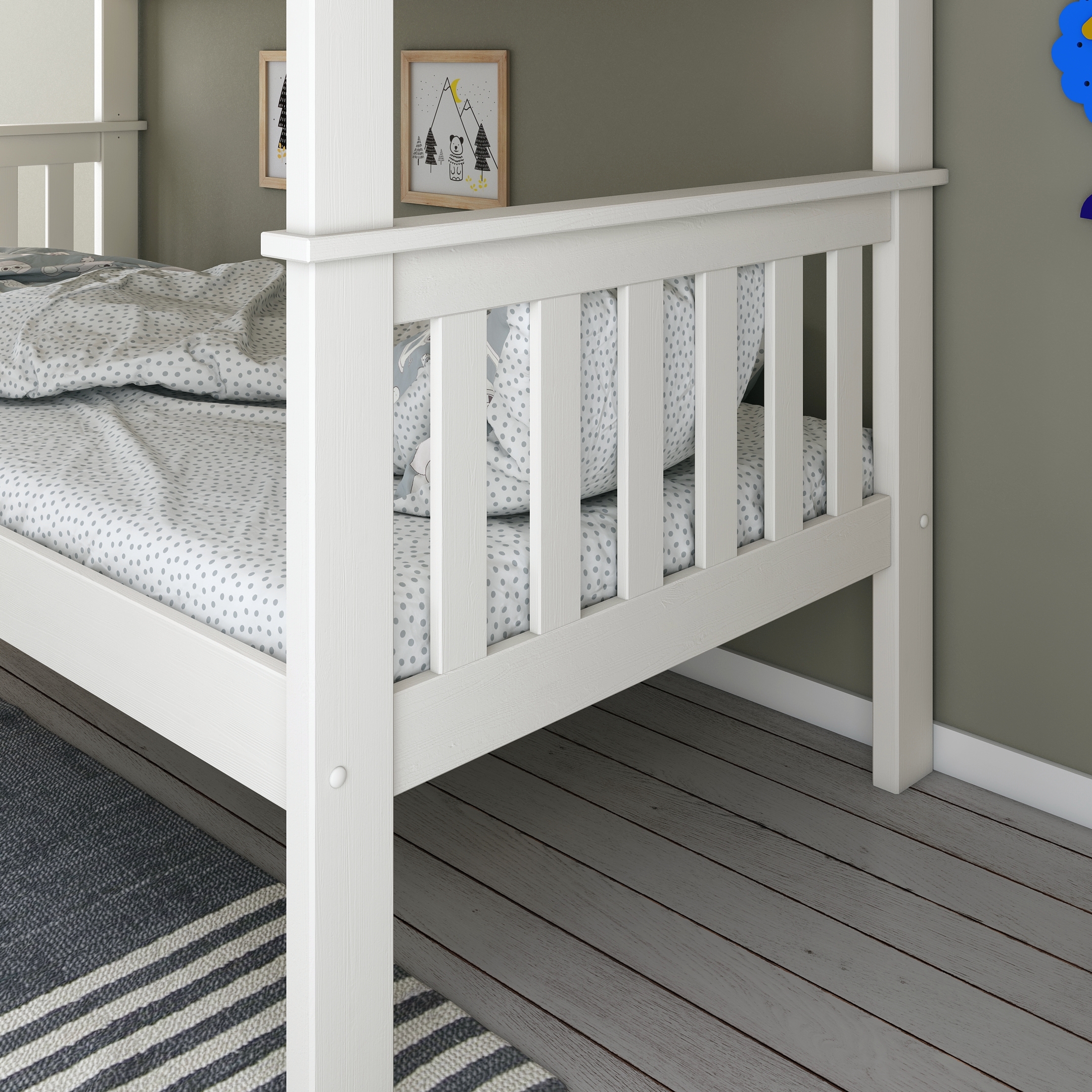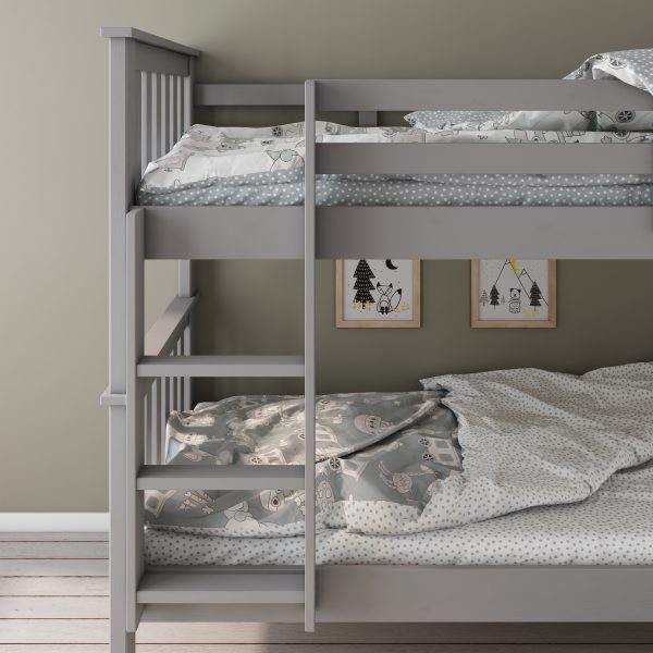 The Carra Single Bunk Bed Frame offers a contemporary and modern look for your bedroom. The bunk bed is made using high-quality pine wood, making it very strong and sturdy and is finished in a lacquer. There are 4 guard rails to the top bunk, 2 to either side which ensures safety for the top bunk sleeper. The ladder is adjustable to either the left or right-hand side, designed to suit any bedroom requirements. The bunk bed can be easily separated into two Single beds and both feature solid slatted bases which provide extra support to the mattresses (sold separately). The headboard and footend of both top and bottom bunks are styled in a matching vertical slatted design. ASSEMBLED DIMENSIONS (cm) L x W x H 205.7 x 109.1  x 157.5 Available in White or Grey – Single or Triple bunk bed.