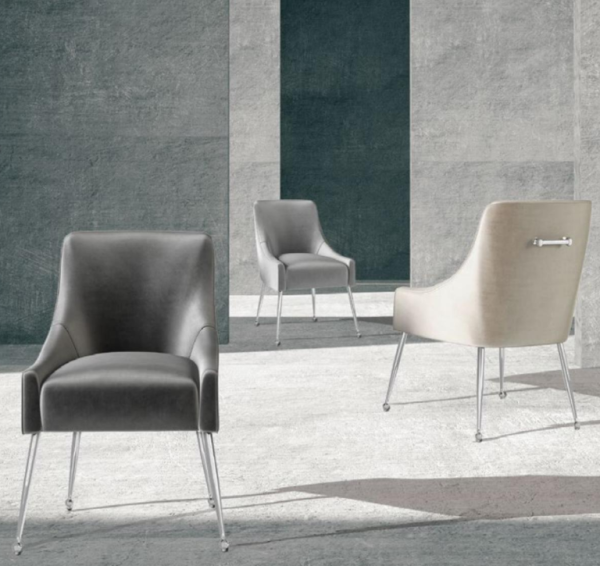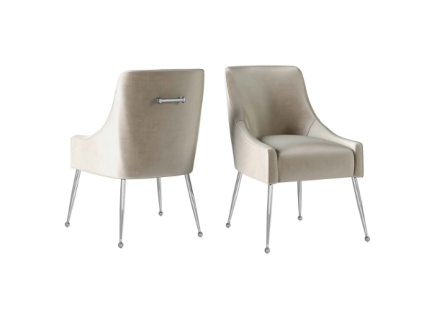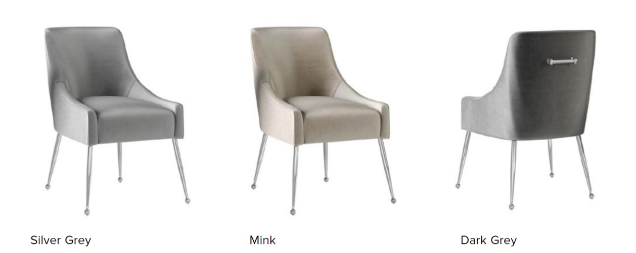 Sumptuous Velvet, Contoured Back Rest, Dense bounce back cushioned seat pad, Stainless Steel Handle, Sublime Design, Polished Stainless Steel Legs, Simple Assembly. Available in Dark Grey, Mink & Silver grey Minimum Order: Set of 2 chairs per box When ordering, quantity (1) is a set of 2 chairs. If you would like 4 chairs – quantity will need to be (2). Dimensions: H88 x W64 x D61cm