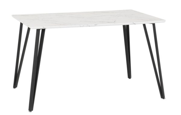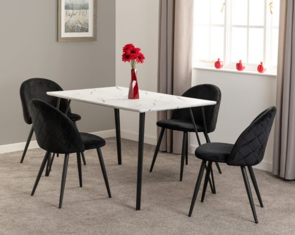 Marlow dining set with 4 chairs will be a contemporary yet compact addition to your home. The table features an elegant marble effect top available in black or white, and metal legs finished in black colour. The chairs are upholstered in high-quality velvet fabric with black metal legs.   Table available in black or white Chairs available in Grey or Black   Dimensions: Table – 1300 x 800 x 755mm Chair – 510 x 600 x 820mm