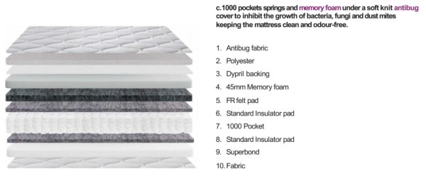 - 1000 pockets springs and memory foam under a soft knit antibug cover to inhibit the growth of bacteria, fungi and dust mites keeping the mattress clean and odour-free