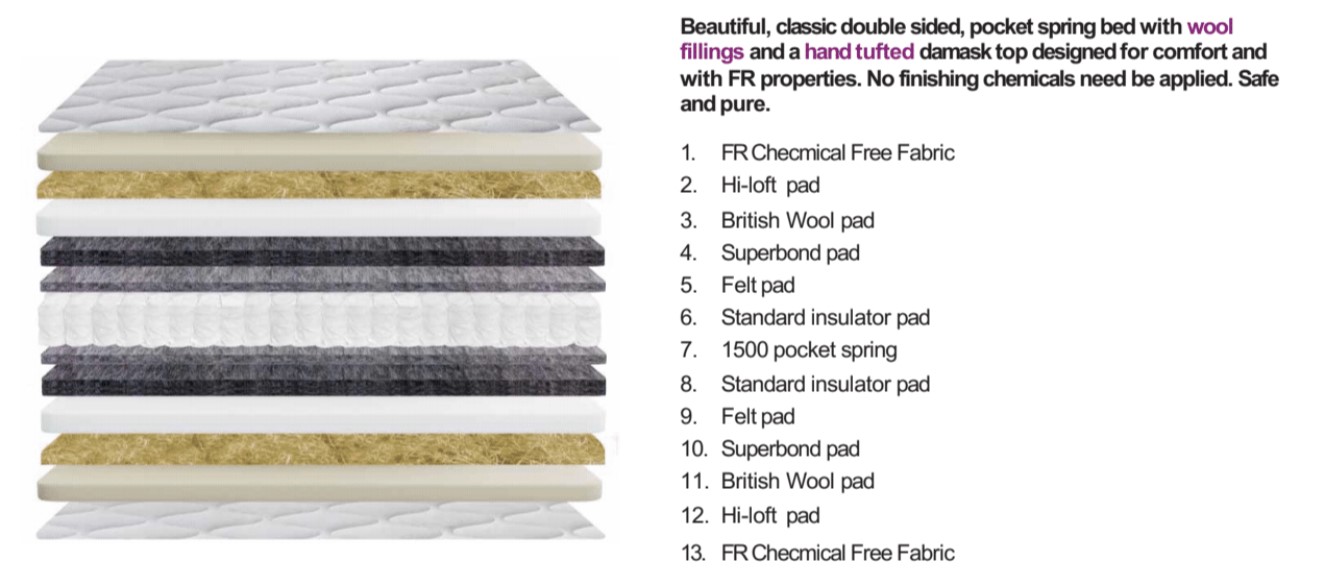 • Beautiful, classic double sided, pocket spring bed with wool fillings and a hand tufted damask top designed for comfort and with FR properties. No finishing chemicals need be applied. Safe and pure