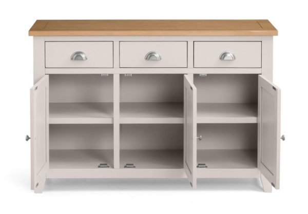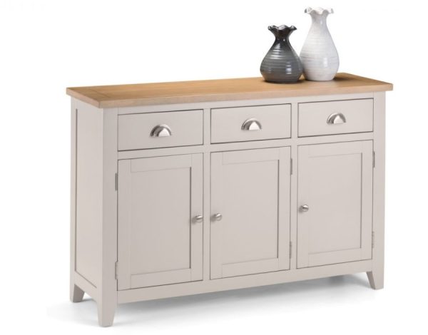 An elegant Sideboard, presented in an immaculate painted, soft Elephant Grey finish with beautiful pale oak top, crafted from a combination of high grade American White Oak solids and veneers. This stylish piece looks beautiful and offers phenomenal storage for kitchen, living or dining room. Includes three practical drawers above a double and single cupboard space, accented with chic cupped handles in a brushed steel finish; ideal for cutlery, crockery and glassware.  The combination of superior quality materials and classic design ensures a timeless appeal and fits perfectly alongside both traditional and contemporary decor.