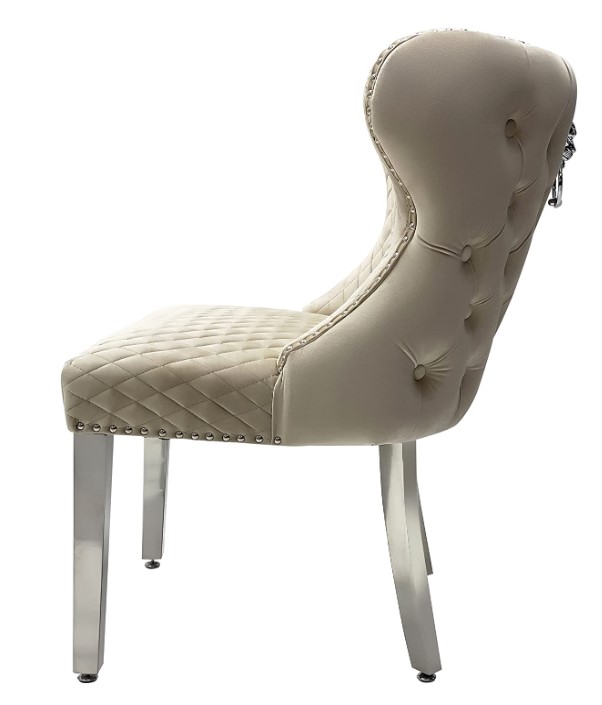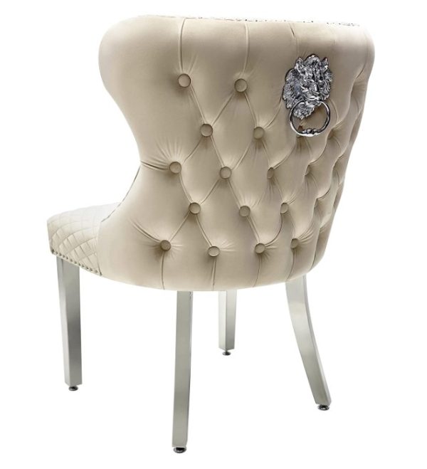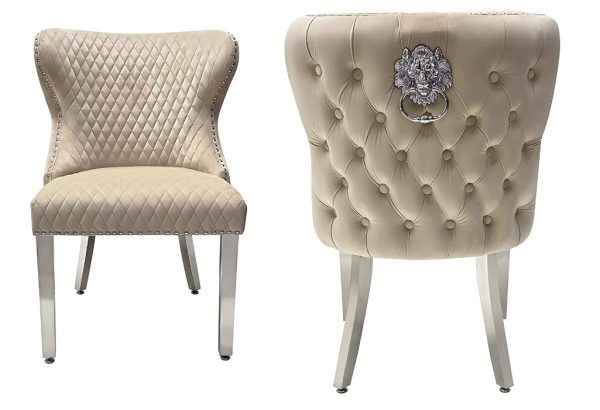 Set of 2 Plush velvet, Lion Head Knocker Dining Chairs Colours available in Velvet – Dark Grey, Mink & Black PU Faux leather available in Hudson Grey Minimum Order: Set of 2 chairs per box