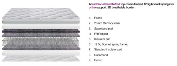 - A traditional hand tufted top covers framed 12.5g bonnell springs for ortho support. 3D breathable border