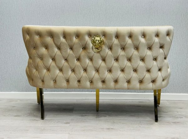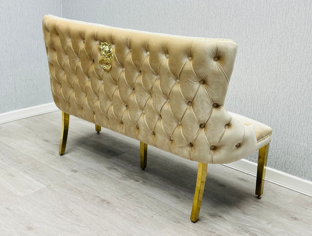 Majestic Lion Knocker design and chrome polished steel legs. Quilted Plush Velvet bench with a studded design, and button detailing.   Available in Black and gold, Cream and gold.   W x D x H cm W160 x D70 x H92